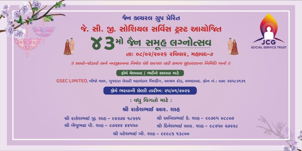 અમદાવાદ, ગુજરાત | ૦૮ ફેબ્રુઆરી ૨૦૨૬ — જૈન કલ્યાણ ગ્રુપ દ્વારા પ્રેરિત અને જે. સી. જી. સોશિયલ સર્વિસ ટ્રસ્ટના આયોજન હેઠળ સમાજસેવા અને સામૂહિક સુખાકારીની ભાવનાને આગળ વધારતા ૪૩મા જૈન સમૂહ લગ્નોત્સવનું આયોજન કરવામાં આવ્યું છે.