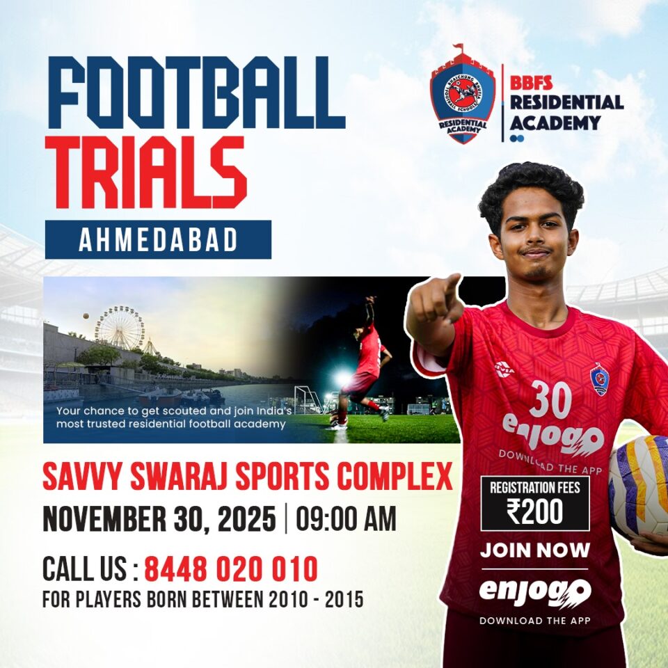 ગુજરાત, અમદાવાદ | ૨૩ નવેમ્બર ૨૦૨૫ — ભારતના સૌથી મોટા અને સૌથી વધુ રેટેડ ફૂટબોલ વિકાસ કાર્યક્રમોમાંના એક, ભાઈચુંગ ભૂટિયા ફૂટબોલ સ્કૂલ્સ (BBFS) અમદાવાદમાં સ્કાઉટિંગ ટ્રાયલનું આયોજન કરશે જેથી BBFS રેસિડેન્શિયલ એકેડેમી માટે પ્રતિભાશાળી યુવા વિદ્યાર્થી-એથ્લેટ્સને ઓળખી શકાય, જે સંસ્થાની મુખ્ય ઉચ્ચ-પ્રદર્શન ફૂટબોલ તાલીમ અને શૈક્ષણિક અભ્યાસક્રમ છે, જે ભારતભરની પ્રતિષ્ઠિત બોર્ડિંગ સ્કૂલો સાથે મળીને યોજાશે. આ ટ્રાયલ રવિવાર, 30 નવેમ્બર 2025 ના રોજ સેવી સ્વરાજ સ્પોર્ટ્સ કોમ્પ્લેક્સ, ગોતા, અમદાવાદ ખાતે યોજાશે, જેમાં સહભાગીઓએ સવારે 9:00 વાગ્યે રિપોર્ટ કરવાનું રહેશે. 2010 અને 2016 ની વચ્ચે જન્મેલા ફૂટબોલ ખેલાડીઓ ભાગ લેવા માટે પાત્ર છે.