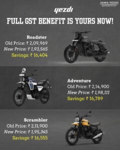 - જાવા યેઝદી મોટરસાઇકલ્સ – સૌથી મોટા વિજેતાઃ 350 સીસીથી ઓછી ક્ષમતા ધરાવતી મોટરસાઇકલ્સ પર જીએસટી ઘટીને 18 ટકા કરવાની સાથે મહત્ત્વકાંક્ષી અને ખરા વારસા જાવા અને યેઝદી મોટરસાઇકલ્સ હવે પહેલા કરતા ઘણી સરળતાથી પ્રાપ્ત કરી શકાય છે. ક્લાસિક લિજેન્ડ્સ ગર્વ સાથે ગ્રાહકોને ઘટાડેવા વેરાનો 100% લાભ આપી રહી છે.