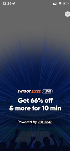 - લાઇવ ક્રિકેટ મેચ દરમિયાન સિક્સ વાગે ત્યારે દર વખતેવપરાશકર્તાઓને ઓર્ડર પર 66%, ₹266, ₹166 અથવા ₹66 ની છૂટ મળી શકે છે