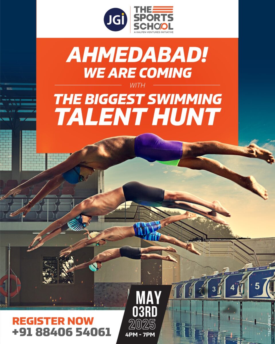 અમદાવાદ ૩૦ એપ્રિલ ૨૦૨૫ – જૈન ગ્રુપની ધ સ્પોર્ટ્સ સ્કૂલ 3 મે, 2025 ના રોજ ગોતાના સેવી સ્વરાજ ક્લબ ખાતે સાંજે 4:00 થી 6:00 વાગ્યા સુધી અમદાવાદની સૌથી મોટી સ્વિમિંગ ટેલેન્ટ હન્ટનું આયોજન કરવા માટે તૈયાર છે.