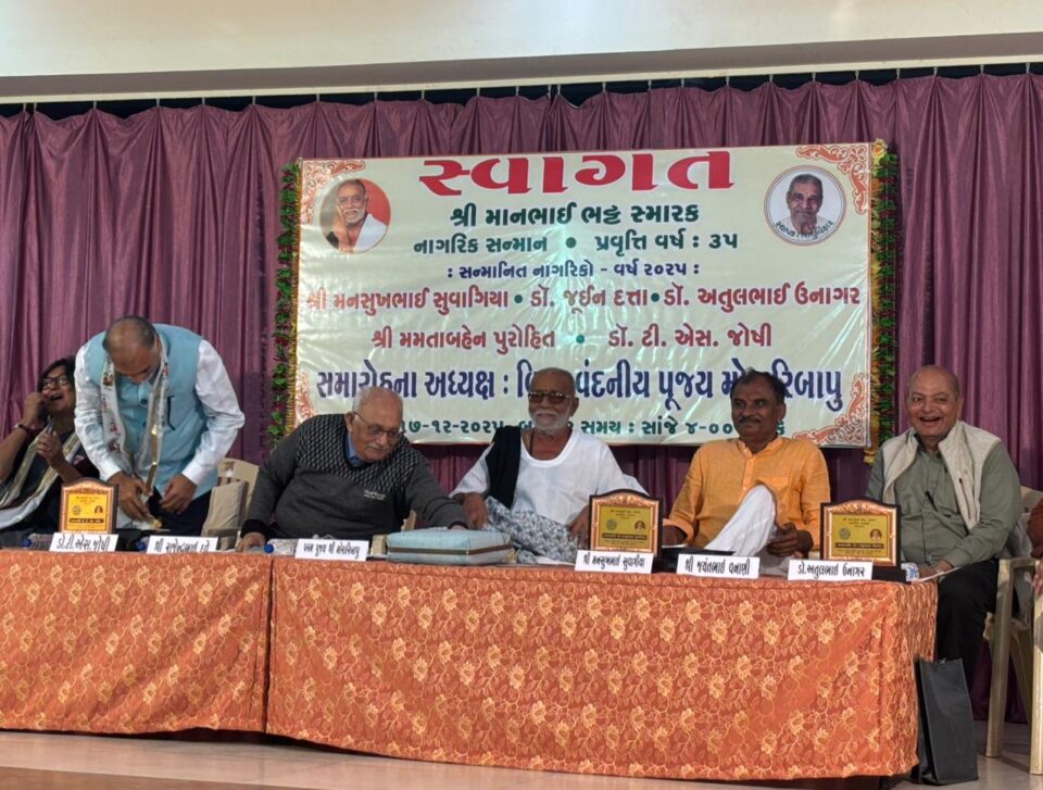 ભાવનગર, ગુજરાત | ૧૮ ડિસેમ્બર ૨૦૨૫ — ભાવનગર શહેરના શિશુવિહાર સંસ્થાના પરિસરમાં સંસ્થાના સ્થાપક લોકસેવક માનભાઈભટ્ટની પુણ્ય સ્મૃતિમાં આયોજિત ૩૫મો નાગરિક અભિવાદન સમારોહ બુધવારે પૂજ્ય મોરારિબાપુના પાવન સાનિધ્યમાં ભાવપૂર્ણ અને ગૌરવમય વાતાવરણમાં યોજાયો.