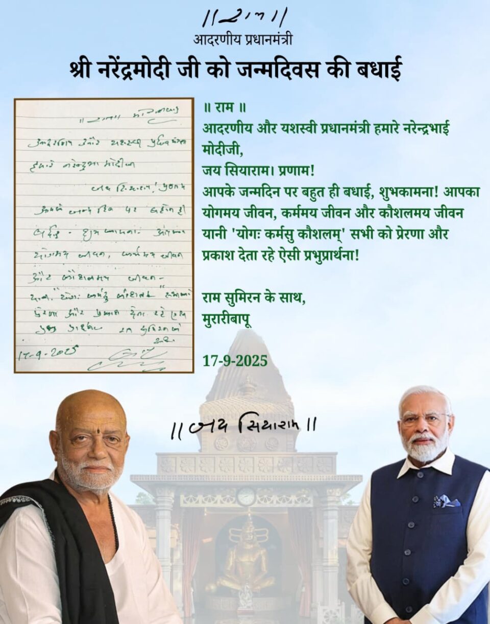 ગુજરાત, અમદાવાદ | ૧૭મી સપ્ટેમ્બર ૨૦૨૫: પ્રખ્યાત આધ્યાત્મિક ગુરુ અને રામચરિત માનસના અગ્રણી પ્રચારક પૂજ્ય મોરારી બાપુએ ભારતના પ્રધાનમંત્રી નરેન્દ્ર મોદીને તેમના જન્મદિવસ પર એક ભાવનાત્મક પત્ર લખ્યો છે. આ પત્રમાં, મોરારી બાપુ પ્રધાનમંત્રીના યોગ, કર્મ અને કૌશલ્યથી ભરેલા જીવનની પ્રશંસા કરે છે અને ભગવાનને પ્રાર્થના કરે છે કે તેમનું નેતૃત્વ દેશ અને વિશ્વને પ્રેરણા અને શાણપણ પ્રદાન કરે.
