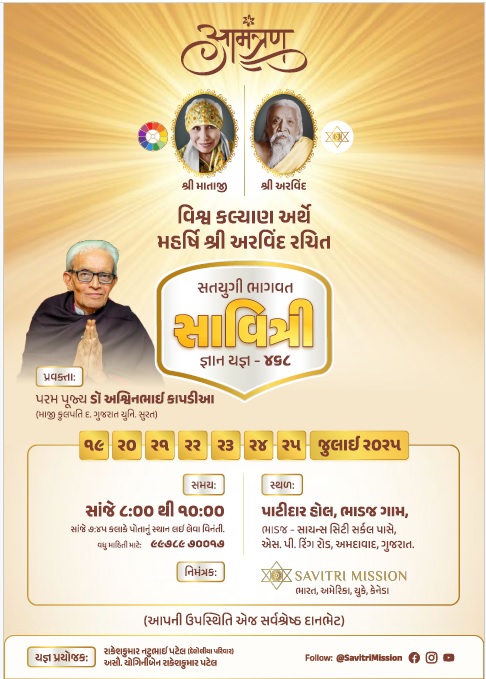 ગુજરાત, અમદાવાદ | ૧૭ જુલાઈ ૨૦૨૫: અમદાવાદના ભાડજ સાયન્સ સિટી સર્કલ પાસે આવેલા પાટીદાર હોલ ખાતે સૌપ્રથમવાર વિશ્વ કલ્યાણ અર્થે મહર્ષિ શ્રી અરવિંદ રચિત ‘સતયુગી ભાગવત સાવિત્રી જ્ઞાન યજ્ઞ’નું આયોજન કરવામાં આવ્યું છે. આ સમગ્ર કાર્યક્રમ નું અયોજન તારીખ ૧૯ જુલાઈથી ૨૫ જુલાઈ સાંજે ૮.૦૦ થી ૧૦.૦૦ કલાકે કરવામાં આવ્યું છે.