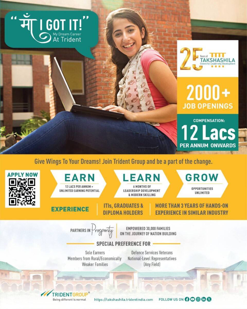 રાષ્ટ્રીય | ૨૮ એપ્રિલ ૨૦૨૬ — ટ્રાઇડેન્ટ ગ્રુપની મુખ્ય કંપની અને ભારતના અગ્રણી વ્યાપારી સમૂહોમાંની એક, ટ્રાઇડેન્ટ લિમિટેડે તેના સમગ્ર ભારતમાં તક્ષશિલા ભરતી કાર્યક્રમની 25મી આવૃત્તિ શરૂ કરી. જે હેઠળ તેઓ તેના ઉત્પાદન કામગીરીમાં ત્રણ વર્ષ સુધીનો અનુભવ ધરાવતા 2,000થી વધુ યુવા સ્નાતકો અને ડિપ્લોમા ધારકોને સામેલ કરશે. આ ભરતી પહેલના ભાગ રૂપે, ટ્રાઇડેન્ટ ટેક્સટાઇલ ઓપરેશન્સ, એન્જિનિયરિંગ, ગુણવત્તા, એકાઉન્ટ્સ, સપ્લાય ચેઇન, ઇન્ફર્મેશન ટેકનોલોજી, એડમિન અને એચઆરમાં વિવિધ પ્રકારની તકનીકી અને ઓપરેશનલ ભૂમિકાઓ માટે અરજીઓ આમંત્રિત કરી રહ્યું છે, જેમાં 12 LPA થી શરૂ થતી કમાણીની તકો મળશે.